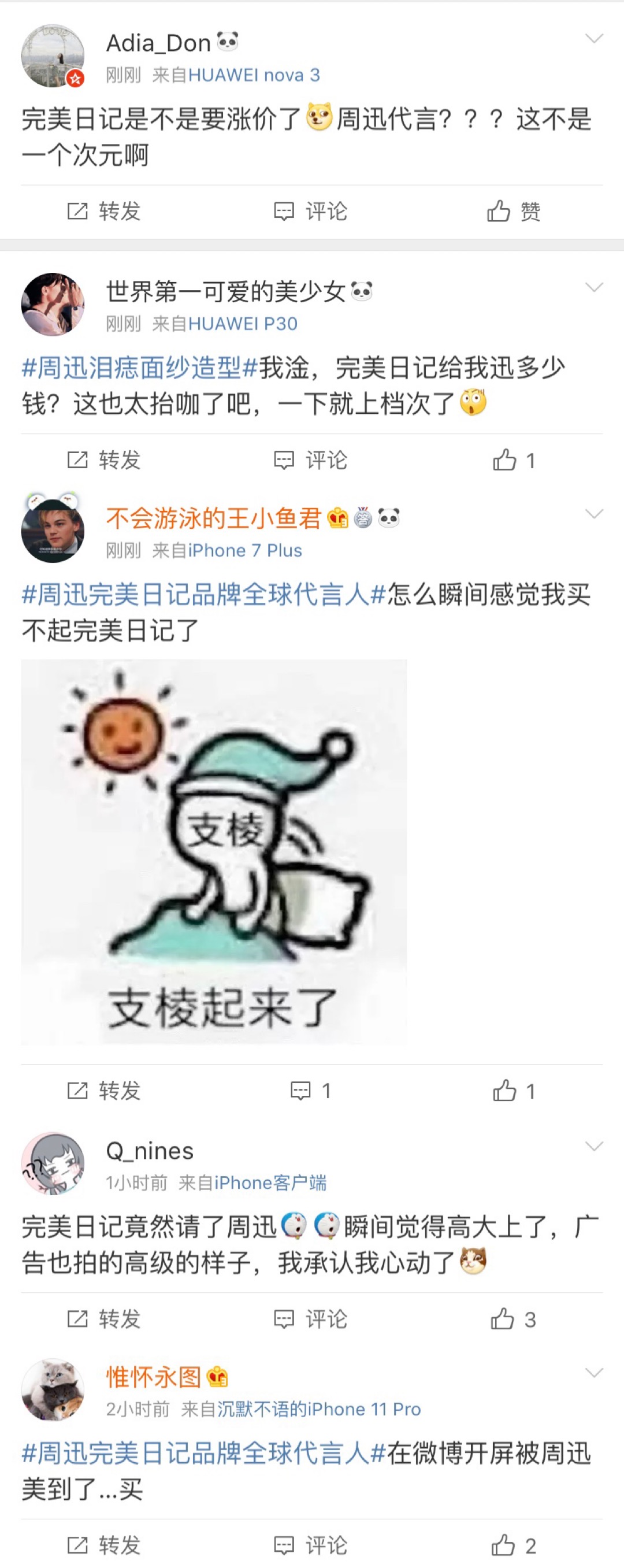 “完美日记是不是要涨价了?”“怎么瞬间感觉我买不起完美日记了?”“品牌调性瞬间不同了诶,这钱花得值。”许多网友认为周迅的代言让完美日记看起来更有质感了。