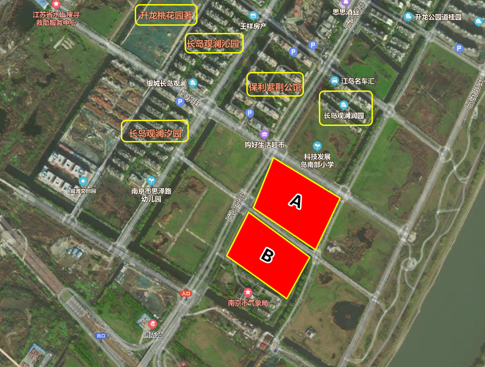 NO.2020G71地块(建邺区江心洲街道中新大道以东、发展五路以北(10-008、10-012)地块)位于江心洲生态科技岛岛北,属于商办及科研用地。地块南侧即为南京市气象局,北侧为科技发展到南部小学。地块周边住宅项目众多,有升龙桃花园著、长岛观澜组群、保利紫荆公馆等。