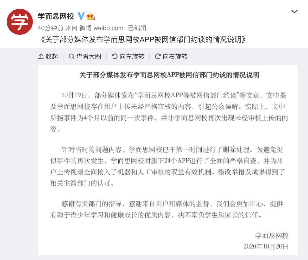 20日晚,@学而思网校官方微博发布关于部分媒体发布学而思网校APP被网信部门约谈的情况说明。学而思网校称,针对当时的问题内容,学而思网校第一时间进行了删除处理,并对旗下24个APP进行了全面的严格自查。