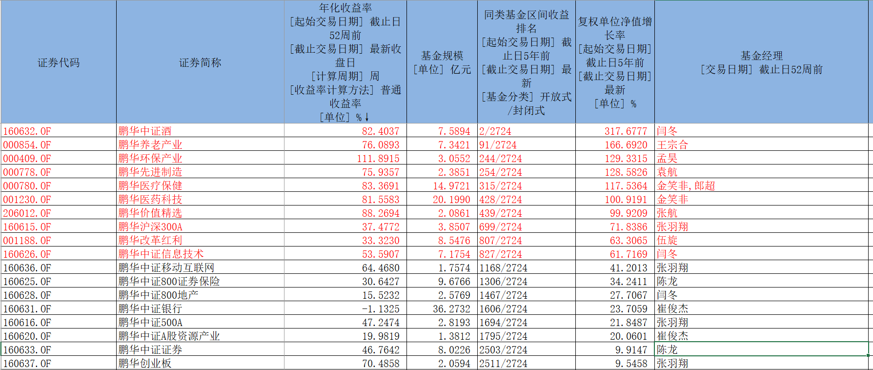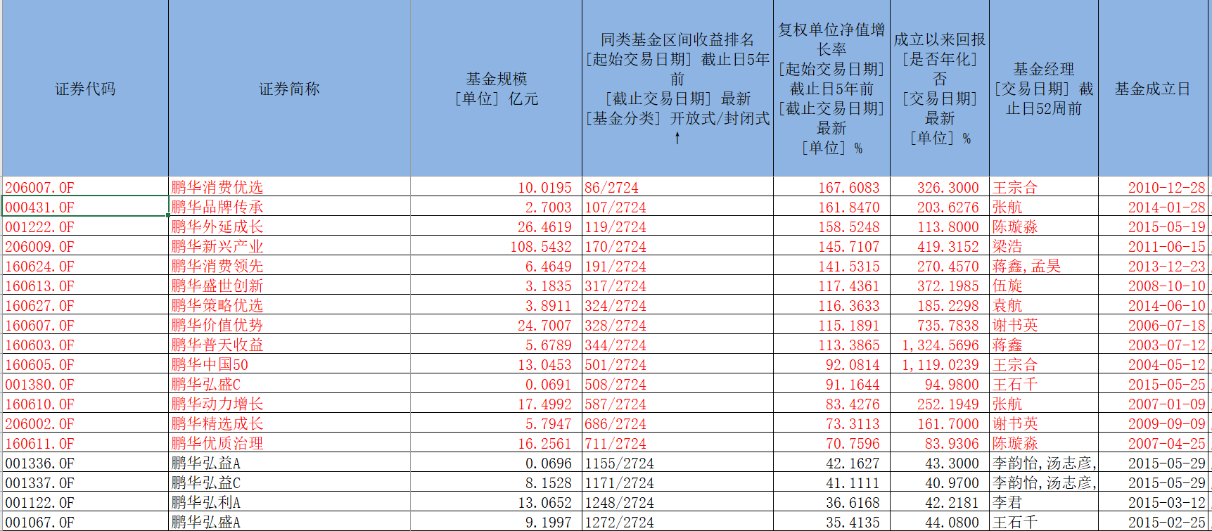 其中,排名第一的鹏华中证酒为分级母基金,近五年来复权单位净值增长率达317.67%,位列2/2724。紧随其后的为王宗合掌管的鹏华养老产业,该基金近五年来复权单位净值增长率达166.69%,位列91/2724。