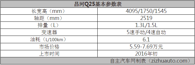 昌河Q25已于此前2015年12月27日在江西景德镇工厂正式下线。与此同时,新车也公布了其预售价,预售价区间为5.59万-7.69万元。