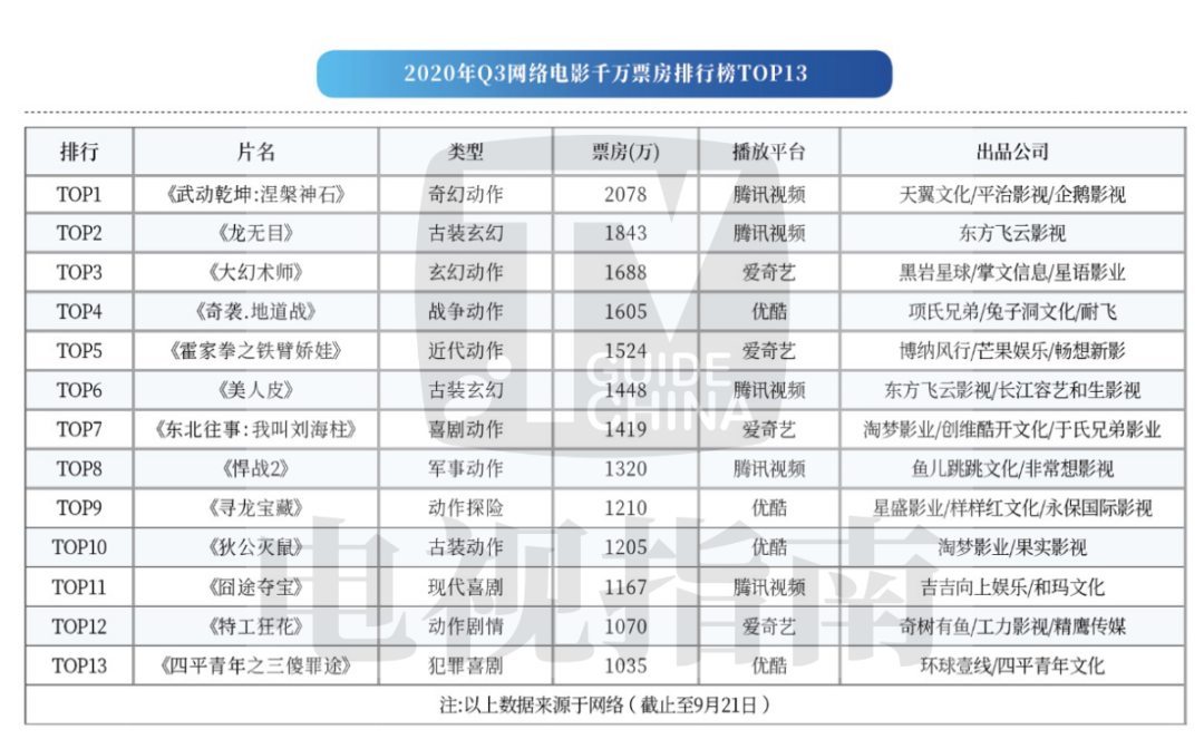 随着《2020年第三季度网络电影调研报告》发布,截止至9月21日三大平台共有13部网络电影票房破千万,在这份榜单中已经很难看到怪兽电影的身影,相反,《奇袭·地道战》《东北往事:我叫刘海柱》和《囧途夺宝》这类现实主义题材网络电影榜上有名。