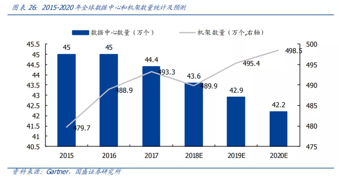 总的来看,全球数据中心的集中度在显著提升。据Gartner测算,2015年-2020年全球数据中心数量将从45万个下降至42.4万个,但机柜总数却由479.7万个提升至498.5万个,形成剪刀差。