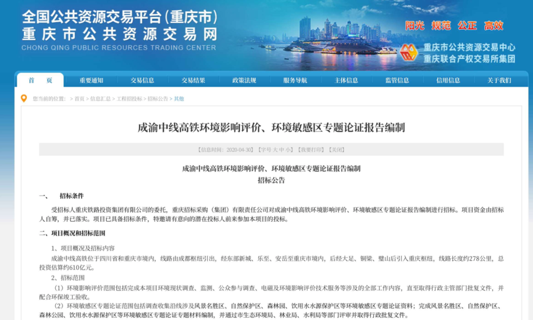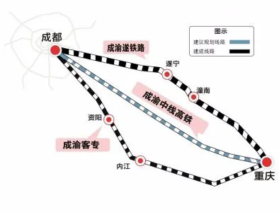 今年4月底,成渝中线高铁环评招标公告显示,成渝线由成都枢纽引出,经成都市东部新城、乐至、安岳至重庆市境内,后经大足、铜梁、璧山后引入重庆枢纽。