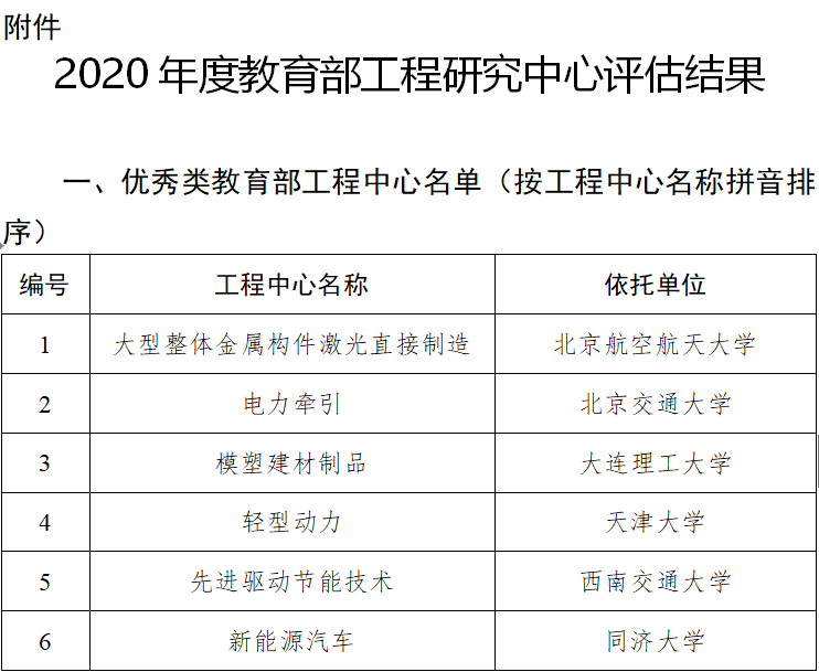 据教育部网站10月21日消息,依据《教育部工程研究中心建设与运行管理办法》,2020年7月至9月,教育部科技司组织实施了机械与运载领域教育部工程研究中心(以下简称工程中心)定期评估。根据初评、现场考察和综合评议的成绩,经研究,54个参评工程中心中,大型整体金属构件激光直接制造(北京航空航天大学)等6个工程中心评估结果为优秀;安全关键工业测控技术(合肥工业大学)等40个工程中心评估结果为良好;其余工程中心评估结果为限期整改或未通过。现将评估结果予以公示,公示期为2020年10月21日-28日。