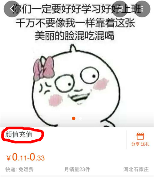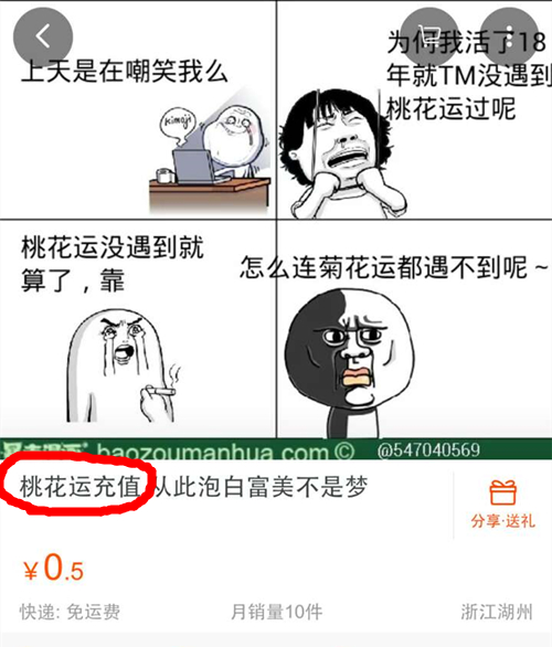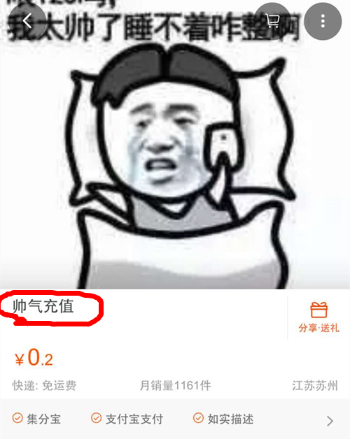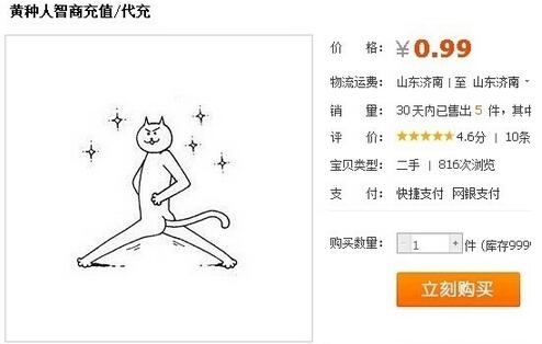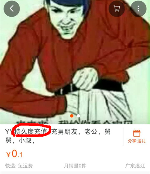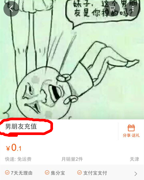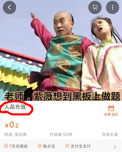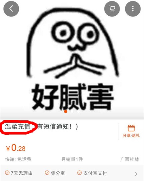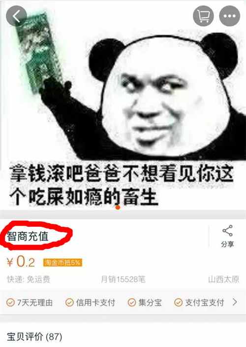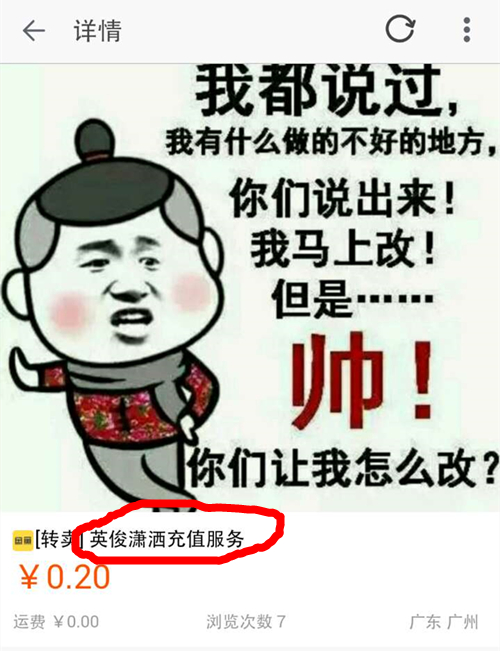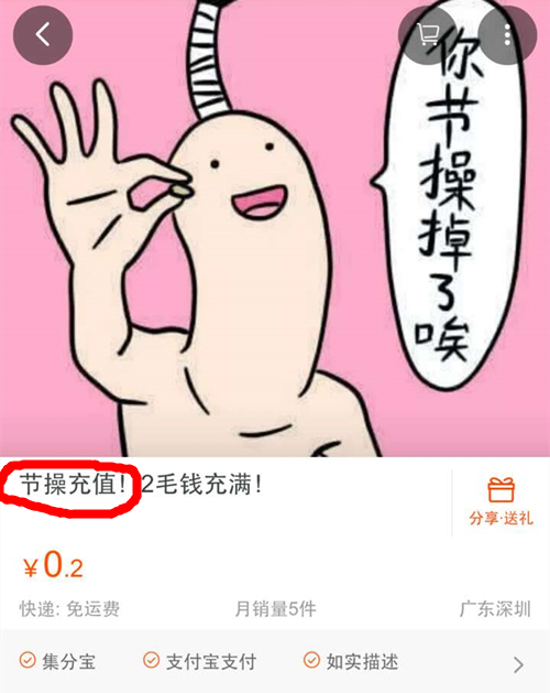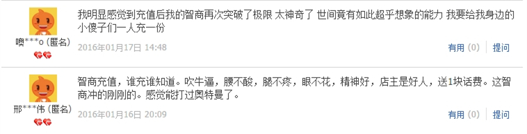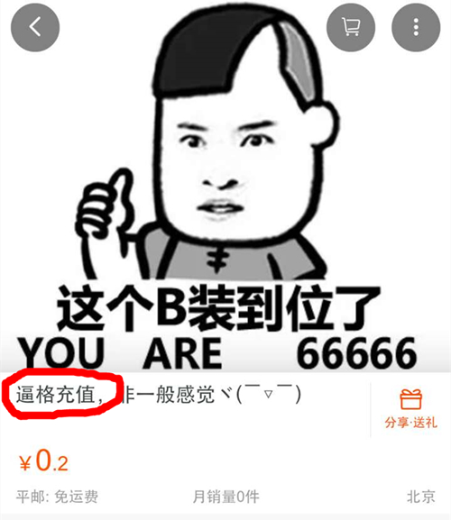 “原价五块钱!!现在只要两毛钱!!!只要两毛钱!!! 月底恢复原价!想充值的朋友赶快下单啦!!! 逗比评价截图还可返现一毛钱!!相当于一半啊!!一毛钱是多少??相当于一个亿啊朋友”