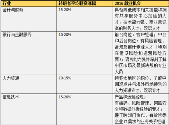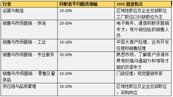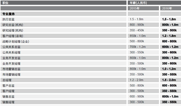 虽然2016年大部分行业招聘放缓,但仍有两大领域突出重围,表现强劲,令部分产业和职位的薪资涨幅高达30%。一是快消行业内具备电子商务经验的人才和销售精英,他们从实质上能够提升公司业绩从而加快公司发展;另一块则是专业服务行业,尤其是具备数字业务、广告或新媒体行业背景的双语人才。