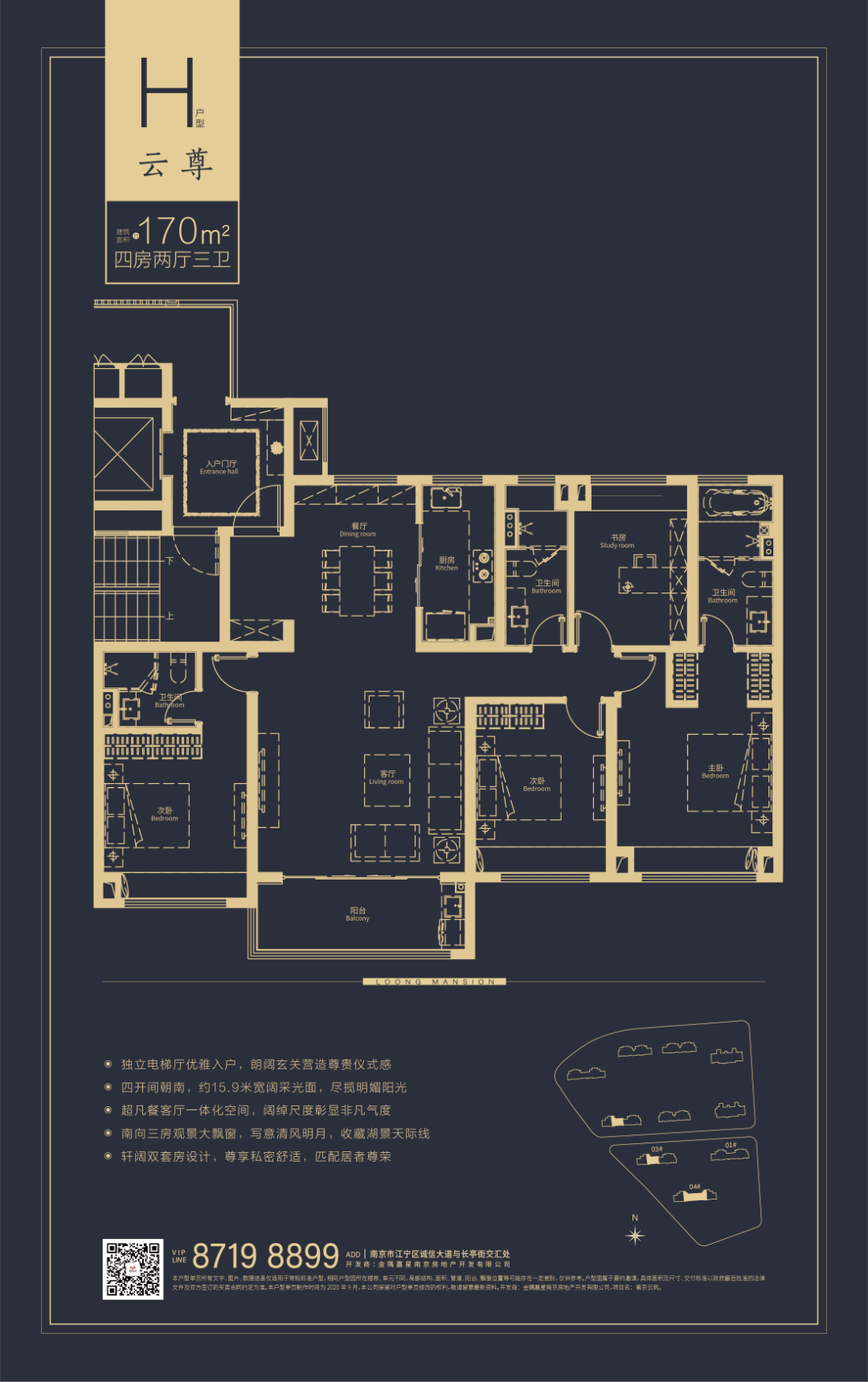 户型特点:建筑面积约170㎡ 的户型,空间尺度感要更加舒适。四开间朝南采光面升至约15.9m;餐客厅一体化空间,动静功能分明;双套房设计,尊享私密舒适;南向三房观景大飘窗,将九龙湖的四季湖景与阳光明媚,一览无余。