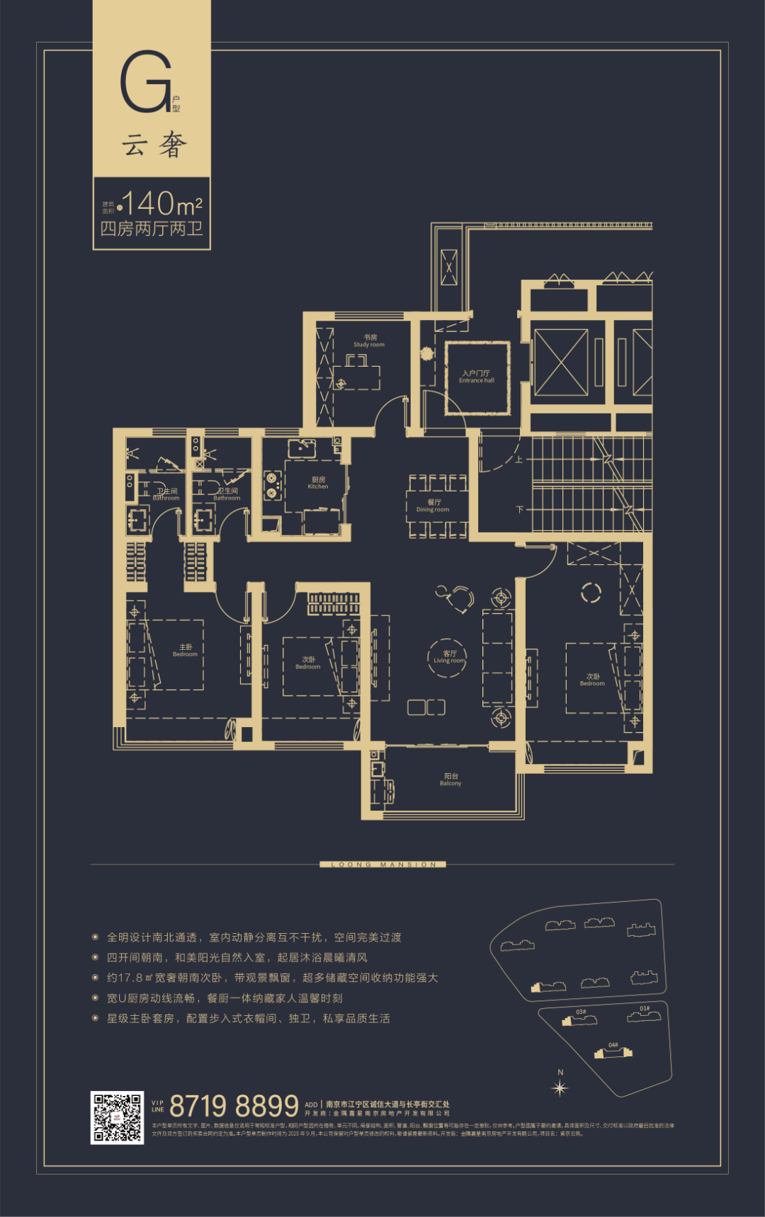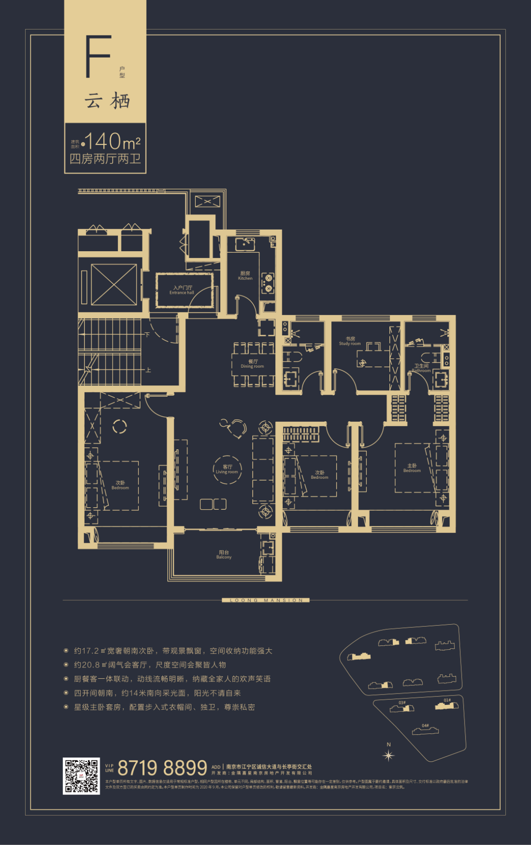 户型特点:同样建筑面积约140㎡的云栖户型,朝南次卧面宽进一步拓展至约19.8㎡,搭配观景飘窗,储藏空间收纳功更能强大、宽U厨房动线更流畅;星级主卧套房,配置步入式衣帽间、独卫,私享品质生活。