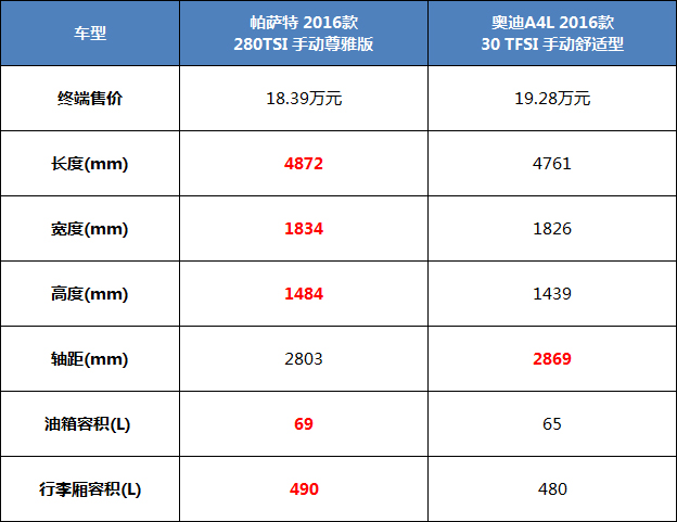 说到外观,这两款车都继承了大众集团没什么特色的优良传统,还是典型的大众脸谱。在尺寸方面,虽然全新帕萨特在轴距方面什么变化,但在长度和高度上都有增加。但比起奥迪A4L的2869mm长轴距来比,显然还有一定的差距。在后排空间方面,奥迪会更好一些。