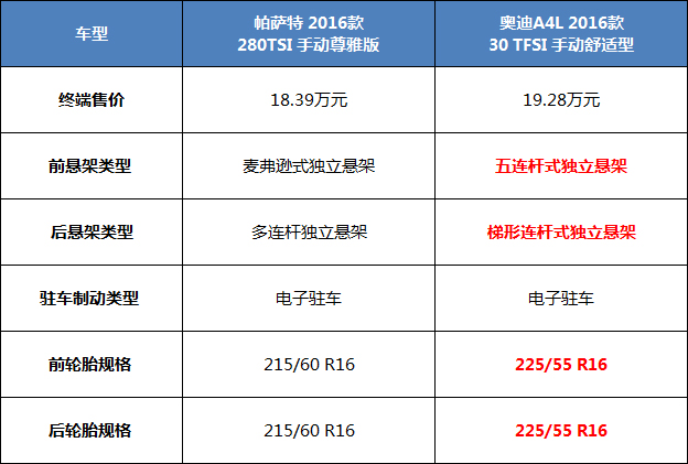 在悬架方面,奥迪采用的五连杆前独立悬架和梯形连杆后独立悬架,相比帕萨特都要厚道一些。另外,在轮胎的选择方面,虽然两款车型都是16寸的,但225/55 R16比215/60 R16的成本方面还要相差1000元左右。