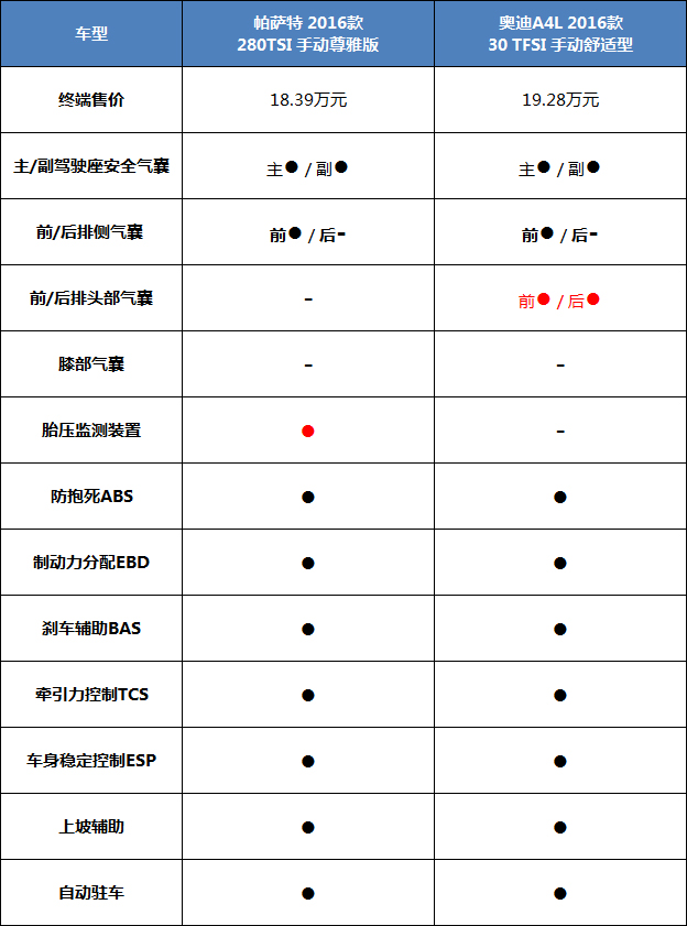 说到安全配置,两款车型做得还不错的。该有基本电子配备都有了,奥迪则是多了前/后排头部气囊,帕萨特则是多了胎压监测,两款车都没膝部气囊有点可惜。