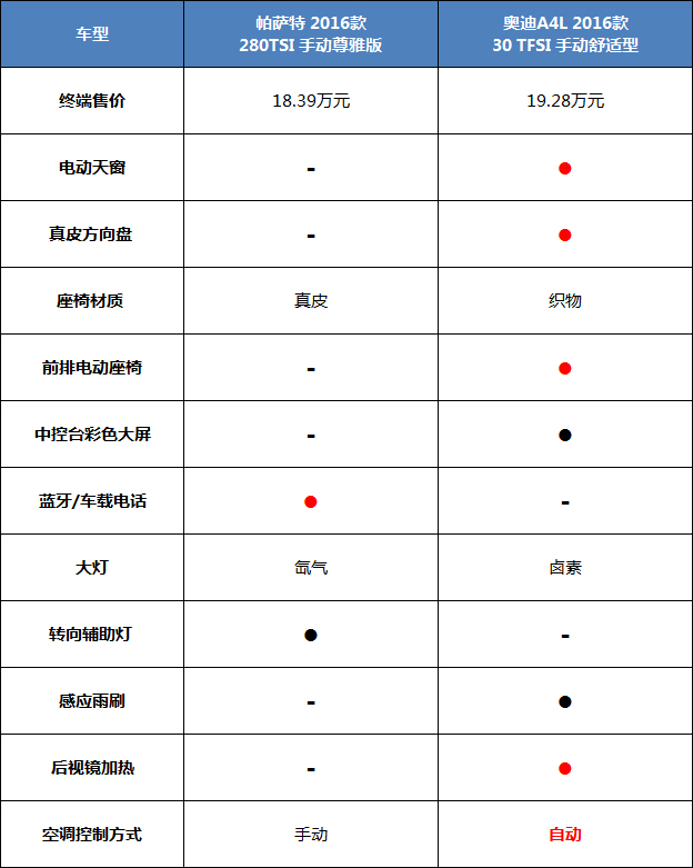 在配置方面,奥迪则有电动天窗、真皮方向盘、前排电动座椅、中控台彩色大屏、感应雨刷、后视镜加热,帕萨特则有真皮座椅、蓝牙电话、氙气大灯、转向辅助灯。两款车可以说各有特点,但整体来说,奥迪则更为豪华。