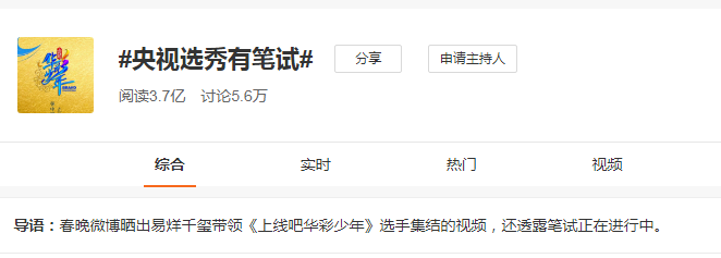 当其他节目还在通过放出选手名单、路透物料的常规手段吸引外界关注,央视就以笔试环节弯道超车成为话题担当。#央视选秀有笔试#话题累积阅读数3.7亿,讨论5.6万条,在六档选秀节目中率先跑出。
