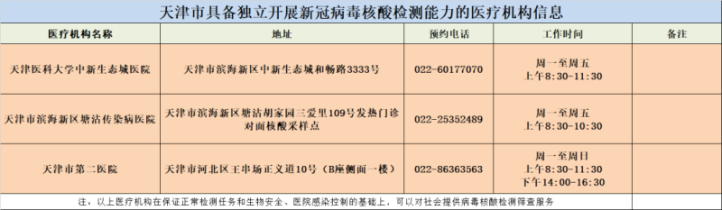 据天津市卫健委,为持续推进天津市新冠病毒核酸检测有关工作,提高检测能力,天津市新增3家二级公立医院具备独立新冠病毒核酸检测能力,可在保证正常检测任务基础上,向社会公众提供新冠病毒核酸检测服务。同时,天津医科大学总医院将工作时间调整为周一至周六上午8:00-11:30、下午14:00-16:00;周日:上午8:00-11:30。截至目前,天津市共有40家公立医院、1家部队医院和14家医学检验实验室具备独立开展新冠病毒核酸检测能力。