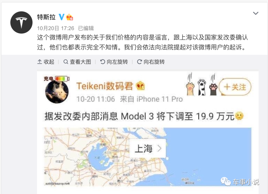 10月20日,针对一位微博用户发文称:“据发改委内部消息 Model 3将下调至19.9万元”。特斯拉在当天下午通过其官方认证微博迅速回应称:“这个微博用户发布的关于我们价格的内容是谣言,跟上海以及国家发改委确认过,他们也都表示完全不知情。我们会依法向法院提起对该微博用户的起诉。”