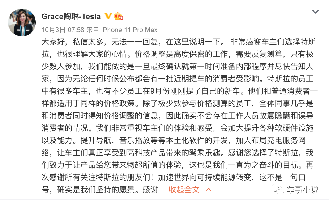 面对老车主们的质疑及内心的不爽,特斯拉对外事务副总裁陶琳在其认证微博上公开回应降价一事时表示,价格调整是高度保密的工作,只有极少数人参加,无论任何时候公布都会有一批近期提车的消费者受影响。
