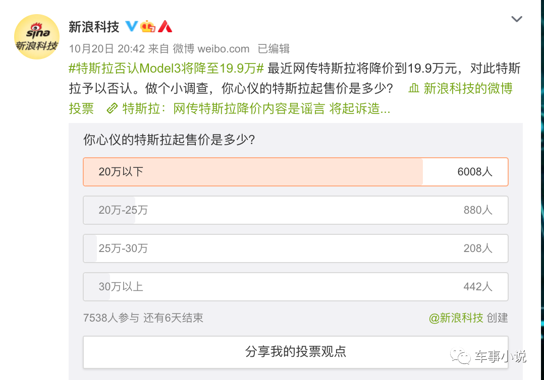 虽然这份在线投票调查的样本总数并不算庞大,但从中也不难看出,多达79.70%参与者选择了20万以下表明,这部分人认为Model 3并不值当前的售价,还有降价空间。