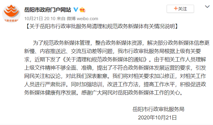 岳阳市政府门户网站10月21日回应称,为了规范政务新媒体管理,整合政务新媒体资源,解决部分政务新媒体信息更新慢、内容推送迟、交流互动差等问题,岳阳市行政审批服务局根据上级有关要求,近期下发了《关于清理和规范政务新媒体的通知》。由于相关工作人员理解上级文件精神不够全面、准确,提出了不符合政务新媒体发展运营的要求,引发网民关注和议论,对此我们深表歉意。我们将对相关要求加以修正,对相关工作人员进行严肃批评。同时加强培训,改进工作方法,提高工作水平,积极促进政务新媒体健康有序发展。感谢广大网民对岳阳政务新媒体工作的关心。