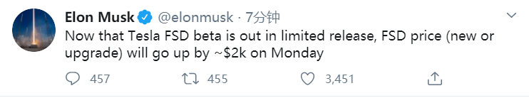 特斯拉CEO马斯克:测试版限量发布后,FSD价格将上涨约2000美元