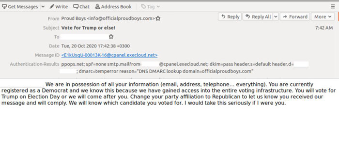 近期,这两州的民主党选民收到了发信邮箱地址为“骄傲男孩”的威胁邮件,邮件标题为“给特朗普投票,否则!”