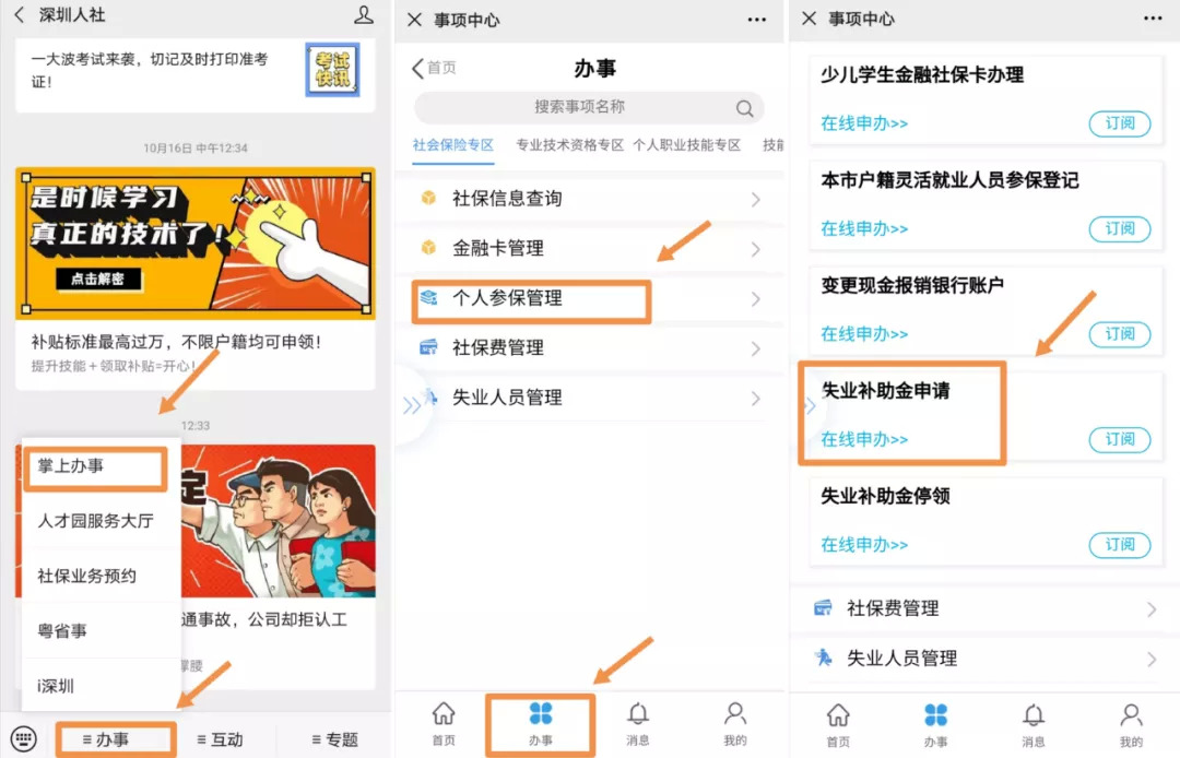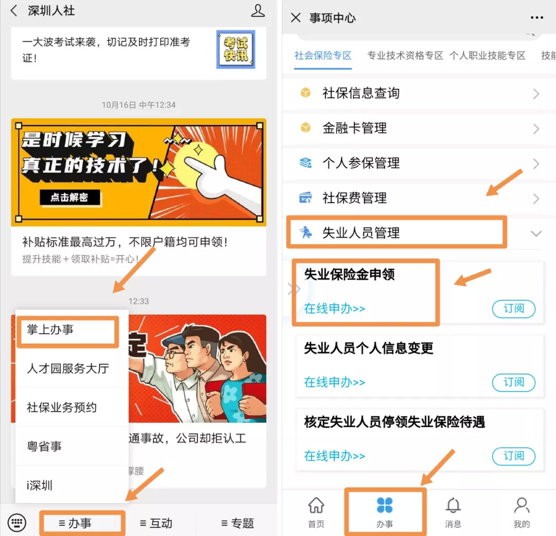以深圳人社为例,点击菜单栏的 【办事→掌上办事→办事→失业人员管理→失业保险金申领】,即可申请。