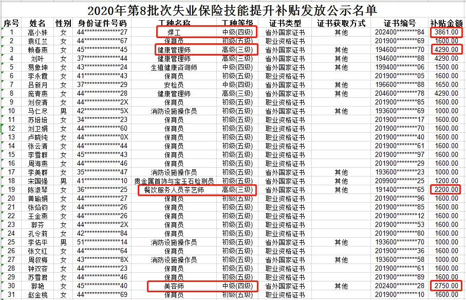 △ 深圳人社局公示的失业保险技能提升补贴发放名单