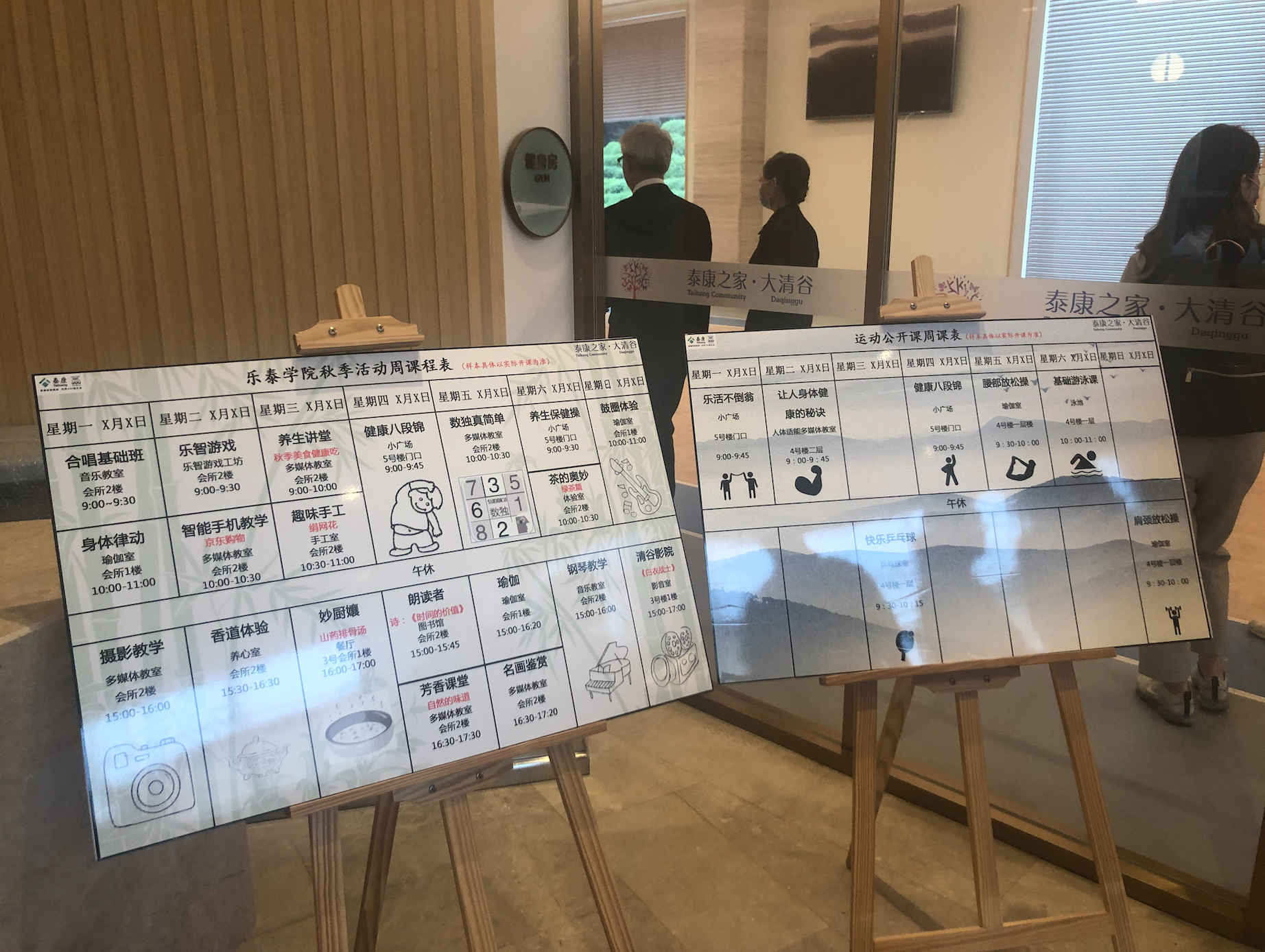 在健身房门口处,记者则发现了两张课程表,一张为乐泰学院秋季活动周课程表,教学课程包括合唱、智能手机教学、养生、手工、烹饪、品茶以及诗会等;另一张则为运动公开课课程表,教学课程包括了八段锦、乒乓球、游泳等。