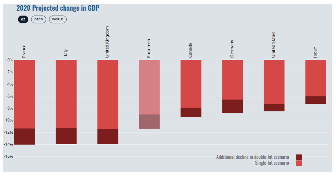 在经合组织最新的预测中,欧元区2020年全年的经济增长率预计为-9.1%,逊色于美国的-7.3%和日本的-6%。