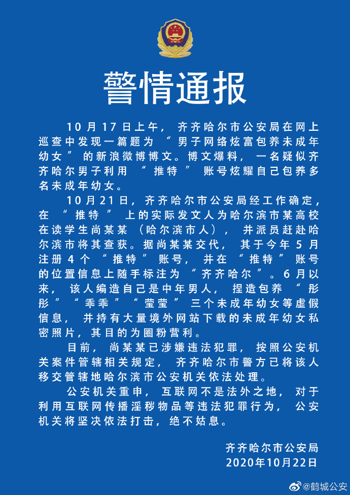 齐齐哈尔公安局官方微博10月22日发布警情通报称,10月17日上午,齐齐哈尔市公安局在网上巡查中发现一篇题为“男子网络炫富包养未成年幼女”的新浪微博博文。博文爆料,一名疑似齐齐哈尔男子利用“推特”账号炫耀自己包养多名未成年幼女。