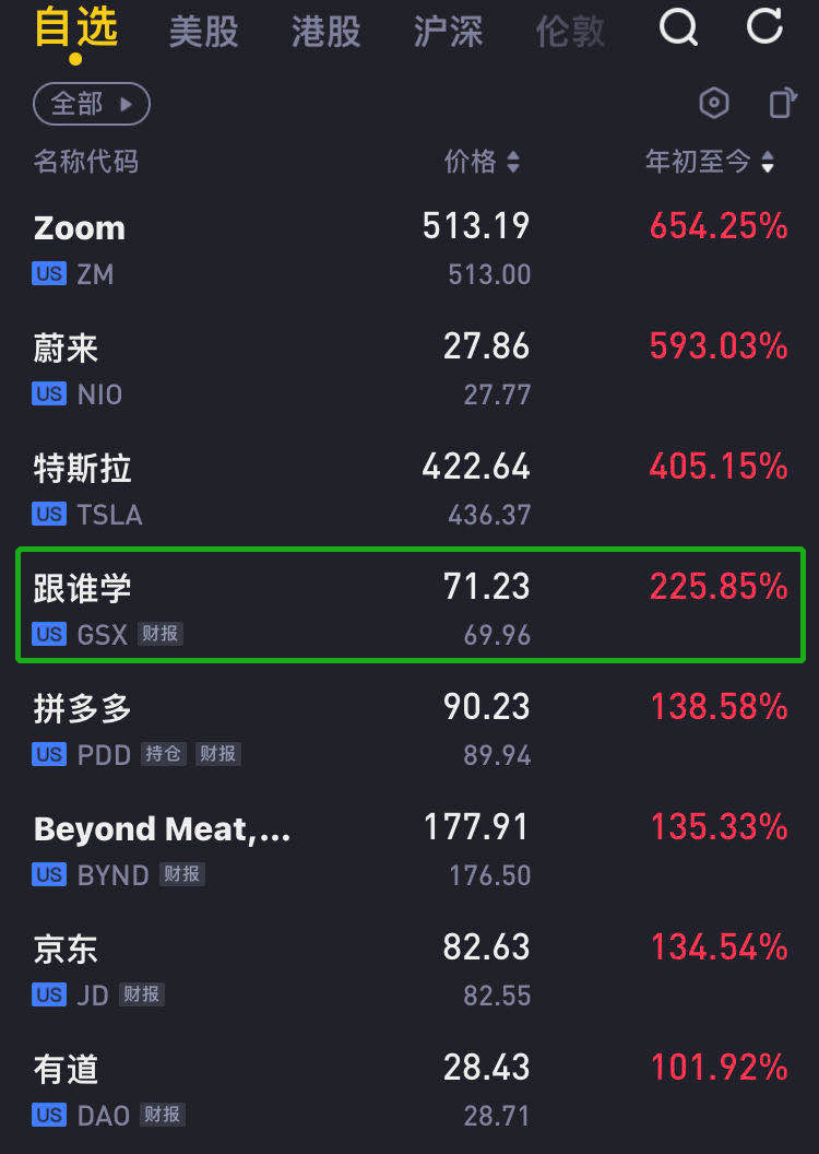 今年以来,以跟谁学为代表的教育公司股价表现不俗。截至美股10月21日交易日,跟谁学的股价在今年已经上涨了225.85%,有道、新东方在线和好未来也分别上涨101.92%、58.33%和55.44%。