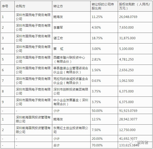 2017年12月21日,国民技术发布收购公告,拟通过全资子公司深圳市国民电子商务有限公司(现更名为"国民科技(深圳)有限公司",下称"国民电商")、深圳前海国民投资管理有限公司(下称"国民投资")收购斯诺实业70%股权,股权收购款合计为人民币133,615.3846万元。