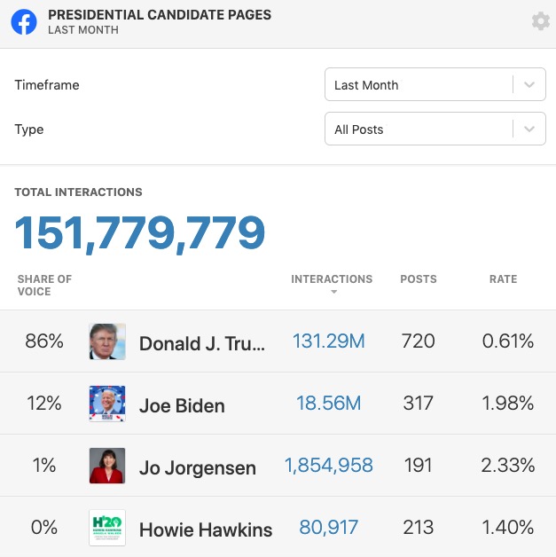 但从互动率上看,拜登在上述两个平台的表现都远超特朗普,分别为1.98%和4.86%,而特朗普仅有0.61%和2.94%。互动率是评判一个社交媒体账号真正关注度的标准,以脸书为例,互动率是通过某一帖子点赞、留言、转发和点击的总人数除以帖子触及的用户数量得出。