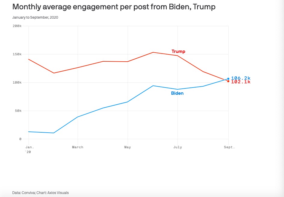 但在特朗普最爱用的社交媒体平台推特,拜登的表现则在大选前夕实现反超。新闻网站Axios援引分析公司Conviva的数据指出,9月拜登推文的平均转发和评论数量达到10.6万,首次超过特朗普的10.2万。但特朗普的推特账号拥有逾8730万粉丝,拜登只有不足1150万。
