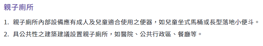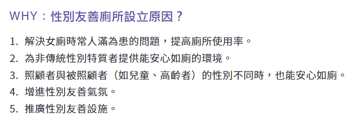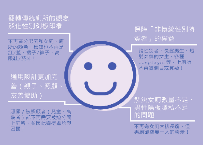 国立台湾大学出版的《国立台湾大学性别友善厕所设计准则及参考手册》里明确写道,这种新型厕所是为了改善女性(尤其是生理期、怀孕期女性),非传统性别特质者,以及需要照顾小孩的家长的处境,而量身定做的。