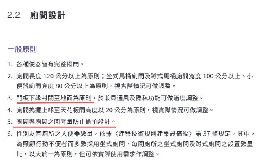 更值得一提的是,性别友善厕所里不仅有完整隔间,还会加装安全设备(防针孔、防偷拍灯光等),以保障使用者如厕的安全与隐私。