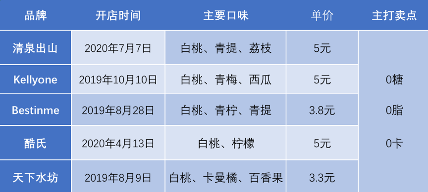 如清泉出山、Kellyone、bestinme、酷氏、天下水坊、好望水等品牌层出不穷,外包装上统一采取清新风格,口味多用桃子、柠檬、青梅、西瓜,宣传重点也是清一色主打“0糖0脂0卡”。