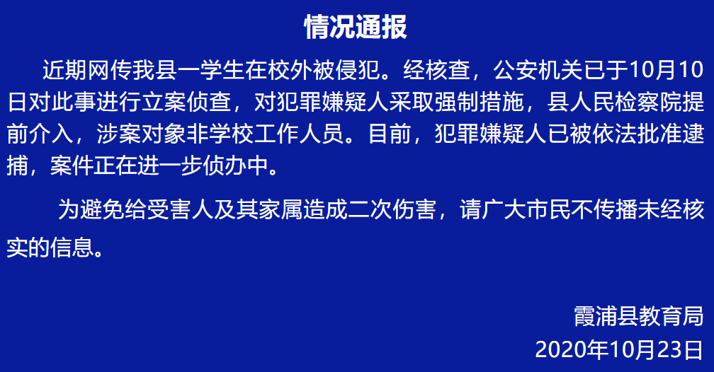 霞浦县教育局微信公号消息,近期网传霞浦县一学生在校外被侵犯。经核查,公安机关已于10月10日对此事进行立案侦查,对犯罪嫌疑人采取强制措施,县人民检察院提前介入,涉案对象非学校工作人员。目前,犯罪嫌疑人已被依法批准逮捕,案件正在进一步侦办中。