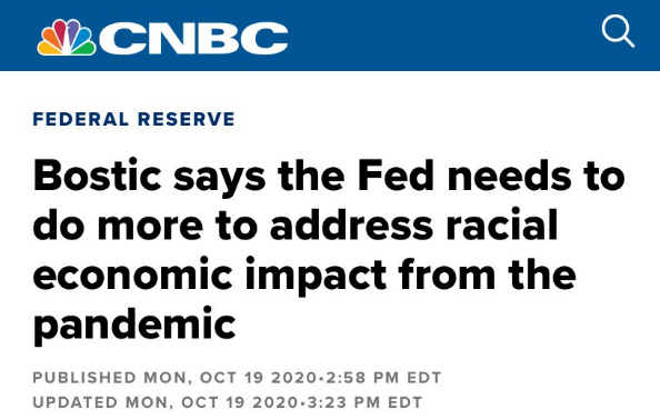亚特兰大联邦储备银行行长博斯蒂克10月19日发表讲话,谈到了疫情期间少数族裔相比白人受到了更为严重的打击,并呼吁联邦政府出台相关措施帮助缩小种族财富差距。