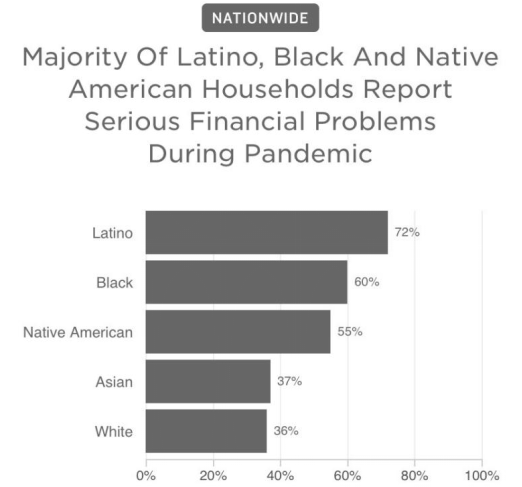 △NPR进行的一项调查发现,疫情期间,拉美裔家庭、非洲裔家庭和白人家庭陷入财务危机的比例分别为72%、60%和36%