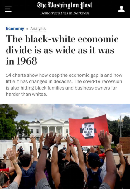 △《华盛顿邮报》报道,2020年非洲裔和白人间的财富差距仍然和1968年一样大
