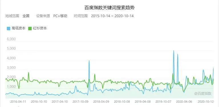 过去多年,红杉资本在中国创投圈的关注度一直要高于高瓴,二者在百度搜索指数上相差一倍。但是变化发生在2020年。从今年初至今,高瓴和红杉的搜索指数基本打平,且高瓴多次超越红杉。