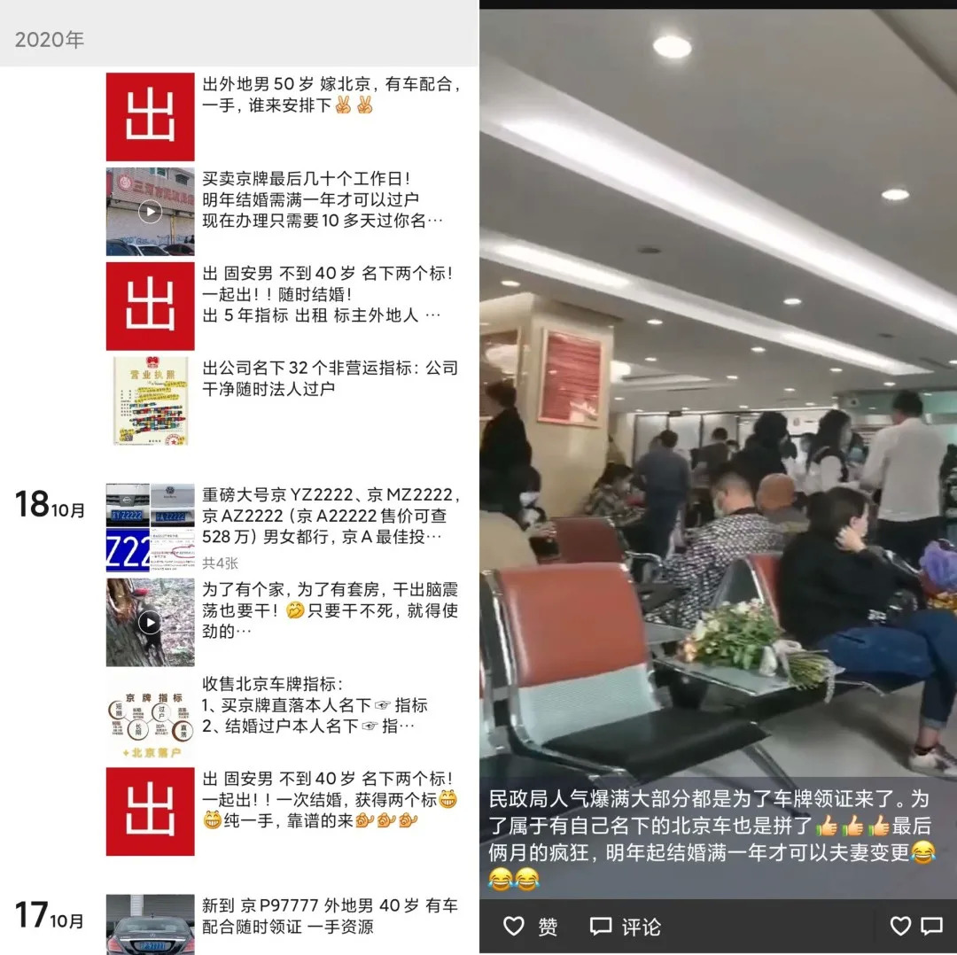 “夫妻变更买卖京牌最快11天办完,再犹豫考虑,可能这个机会就没有你了!明年办理完一个名下车牌需要一年半的时间!需要的抓紧时间联系我!”赵缪的朋友圈充斥着各种关于京牌交易的信息,从他发布的朋友圈信息来看,买卖车牌的不在少数,不管是车管所预约还是民政局办理手续,都是人山人海。