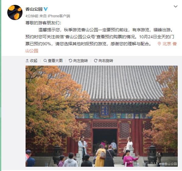 香山公园官微10月24日发布温馨提示称,秋季游览香山公园一定要预约前往,有序游览,错峰出游。游客预约时可关注微信“香山公园公众号”查看预约购票的情况。香山公园表示,10月24日全天的门票已预约90%,请游客选择其他时段预约游览。
