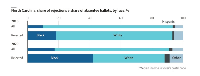 目前收到的邮寄选票中,共有17%来自黑人,但废票中黑人占的比例却高达42%。2016年时黑人共寄出10%的邮寄选票和18%的废票。拉美裔和其他少数族裔选民的被拒率也有提升。此外,低收入群体邮寄选票被拒率普遍高于高收入群体。