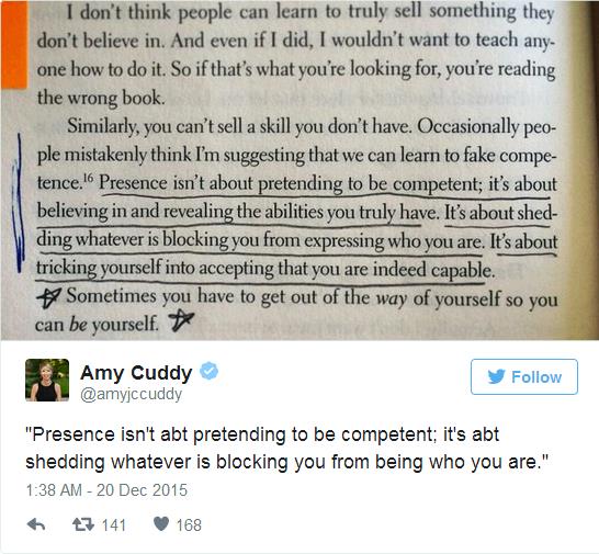 哈佛商学院教授艾米·卡蒂(Amy Cuddy)的新书《展现自己》(Presence)是这样描述的:当人与人首次碰面时,往往通过两个问题来判断对方: