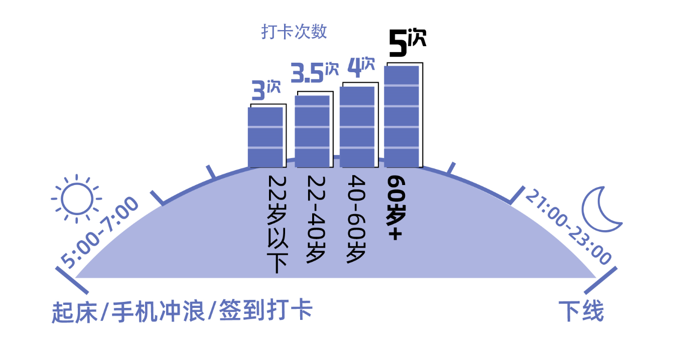 在之后的一天里,80%的老人都会签到打卡。老人们从凌晨5时开始规模化上线,到晚上9时~11时下线。在此期间,老人登录APP的次数少则两三次,多则十几次。据报告统计,老年用户平均一天登录5次APP,高于其他年龄段的用户。
