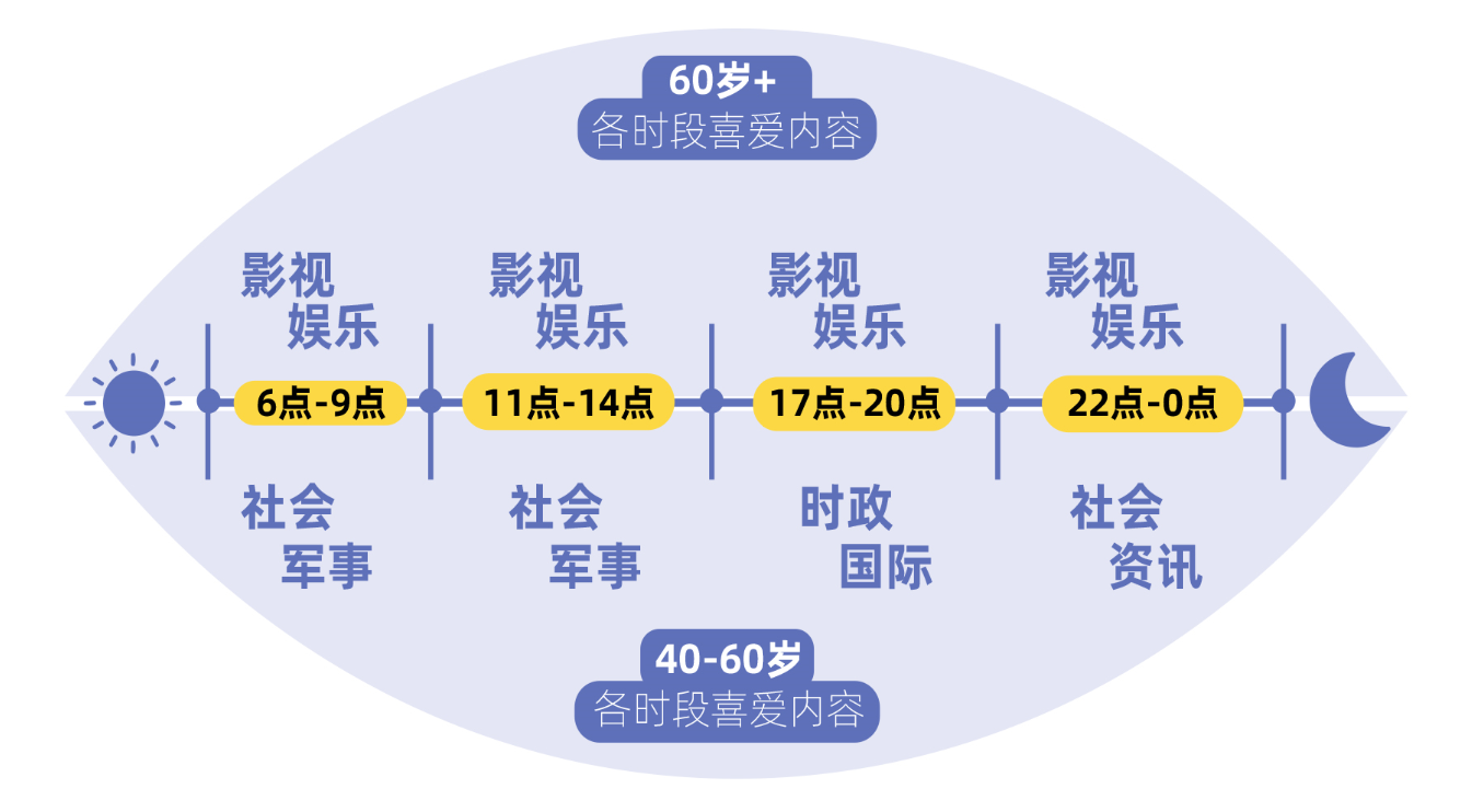 在一天中的早、中、傍晚、夜晚四个网络高峰时段,40岁以上中年人最关注的的内容分别是热点资讯、社会、时政、军事;而已退休的60岁及以上老人在早、中、傍晚关注的都是娱乐和影视,在此基础上,晚上10时到凌晨1时,老人们会看一些社会资讯。