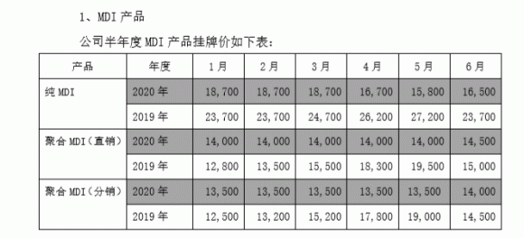 据其公布的2020年上半年主要经营数据,万华化学各MDI产品的挂牌价均有不同程度地下降,其中纯MDI下降明显。此外,石化产品降价幅度也都超过11%。