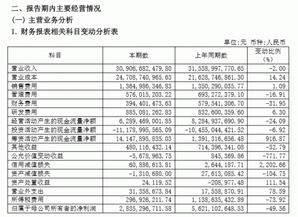 据万华化学中报显示,2020年上半年,万华化学营业成本为247.07亿元,同比增加14.24%,远超营收的增幅,其中,万华化学石化系列产品营业成本就高达104.10亿元,然而,从整个公司的营收来讲,据万华化学中报显示,万华化学却下降了2%。